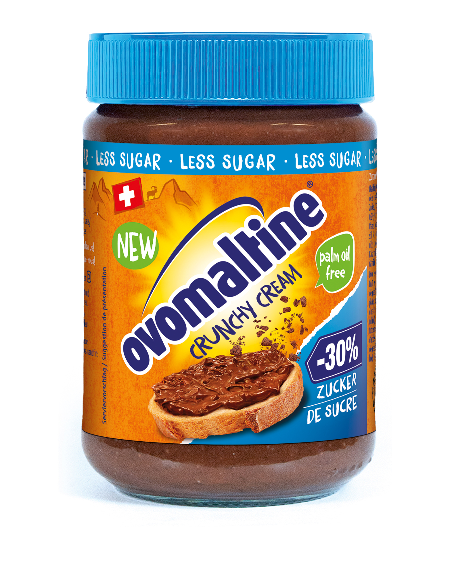 Der Ovomaltine Brotaufstrich wird seit neun Jahren in Neuenegg, am Sitz der Wander AG, hergestellt. Nach über zwei Jahren Entwicklungszeit ist es dem Ovo-Team gelungen, das Palmöl in der Ovomaltine Crunchy Cream durch Schweizer Rapsöl zu ersetzen; ohne Abstriche bei der Qualität. Selbstverständlich kommt auch der neue zuckerreduzierte Brotaufstrich ohne Palmöl aus. Ovomaltine Crunchy Cream Less Sugar ist seit dieser Woche im Lebensmittelhandel erhältlich.